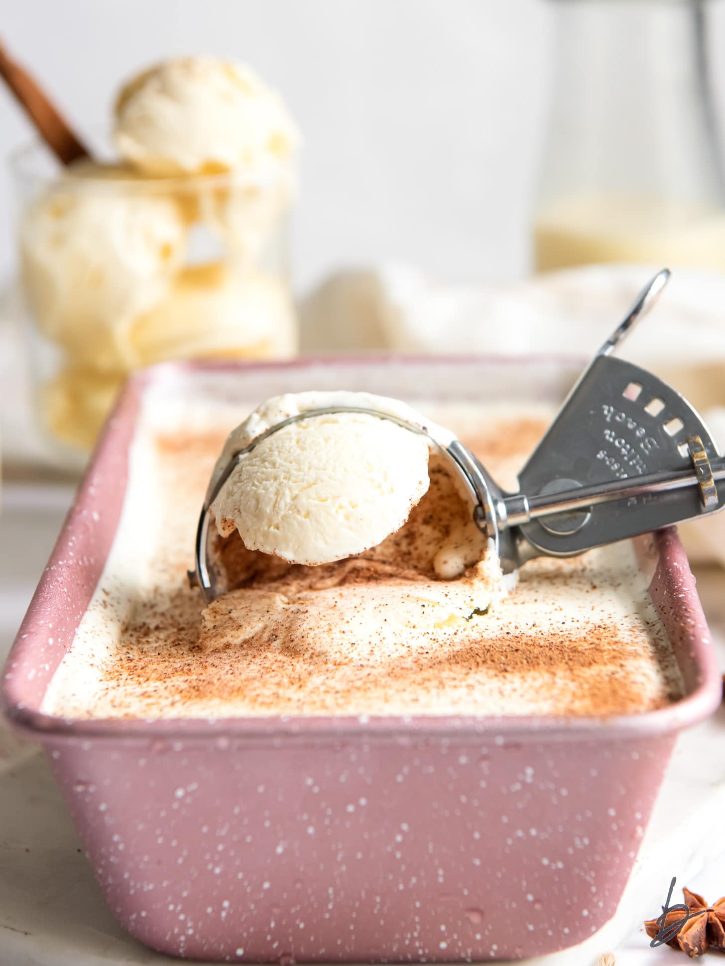 Eggnog is one of my favorite flavors to experiment with this time of year. It’s so creamy and delicious, I love incorporating it into my baking (did you see the cupcakes I made?) The flavor lends itself well to desserts so it’s no surprise that I was eager to try making ice cream with it.