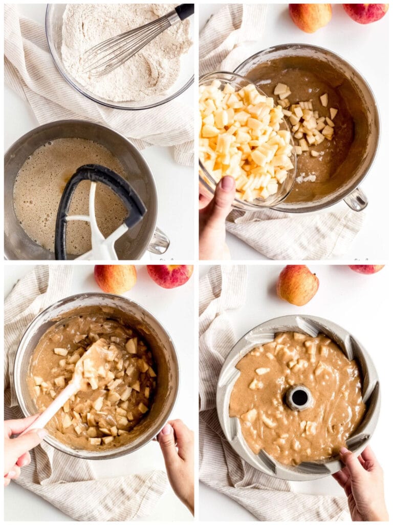 A fresh apple bundt cake call for a list of ingredientsโ โmost of which you can find in your kitchen! Flour, baking soda, cinnamon, nutmeg and salt make up the dry ingredients. Vegetable oil, brown sugar, granulated sugar, eggs, vanilla and apples make up the rest of the ingredients.
