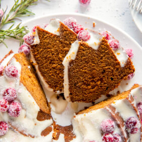 Brown sugar and molasses give this cake its beautiful brown color and add sweetness to it. It also includes popular warming spices such as cinnamon, ginger, nutmeg and allspice which gives this dessert its notorious festive flavor. The cream cheese topping works perfectly with this gingerbread bundt cake recipe and the sugared cranberries add a burst of sweetness to every bite.