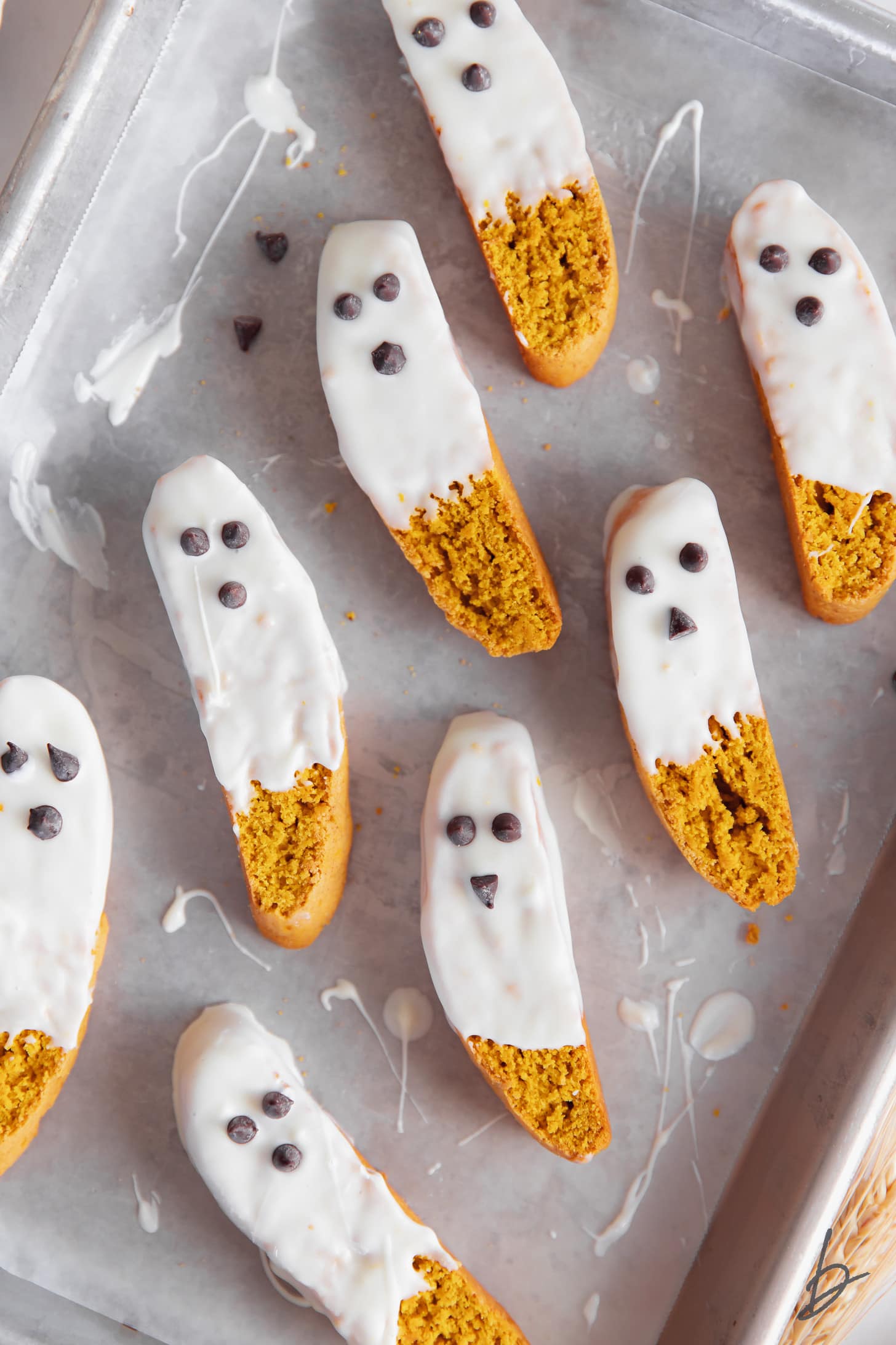 Looking for a fun fall treat? Dip pumpkin biscotti in white chocolate and garnish with mini chocolate chips to make BOO-scotti! They last for up to two weeks or all through Halloween season.