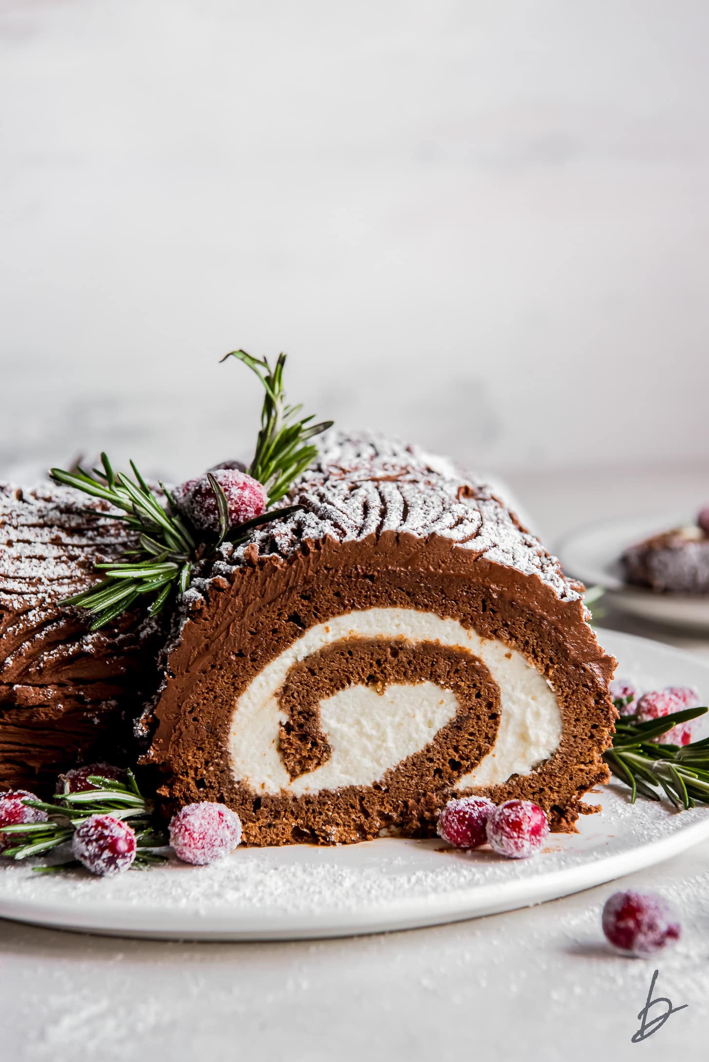 I like to keep it simple with decorations and use just cranberries and rosemary sprigs. However, you can also decorate your bûche de noël with meringue mushrooms, chocolate shavings or sliced almonds. If you have some candy, snowflake cookies, chopped nuts or fresh fruit, you can use that as garnish too.